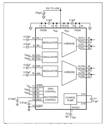有些低開(kāi)關(guān)頻率(200kHz至300kHz)應(yīng)用不適合采用圖5c所示的方案。對(duì)于這類(lèi)產(chǎn)品可能需要采用其他方法和拓?fù)浣Y(jié)構(gòu)。MAX9704立體音D類(lèi)放大器(圖6)可設(shè)置為940kHz固定頻率模式(FFM)(FS1=低,F(xiàn)S2=高),此時(shí)效果最佳。工作在FFM模式下的MAX9704通過(guò)引腳選擇將開(kāi)關(guān)周期設(shè)為恒定值(具有三個(gè)可選項(xiàng)),以滿(mǎn)足應(yīng)用需求。