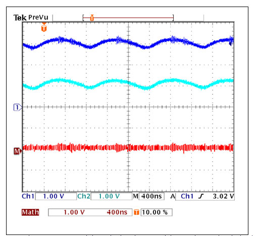 8.頂部跡線(xiàn)顯示了圖5a電路輸出中殘余的紋波電壓,紋波成分主要為開(kāi)關(guān)頻率基波(此時(shí)為940kHz)。濾波器高于該頻點(diǎn)的二階滾降很好的抑制了所有高次諧波。紋波幾乎只有共模分量(底部的跡線(xiàn))。