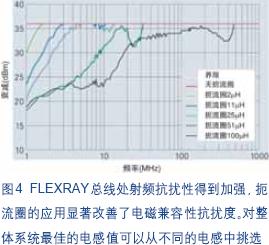 物理層應(yīng)用指南明確指出了對(duì)FlexRay網(wǎng)絡(luò)數(shù)據(jù)線扼流圈的總體要求,比如引線電阻(<1W)、電感(>50mH)以及雜散電感(<1mH)。對(duì)電磁輻射和電磁干擾的測定與CAN總線一樣。不過,由于10Mbit/s的更高傳輸率,需要更加仔細(xì)地檢查信號(hào)完整性。圖4所示為對(duì)具有各種電感的扼流圈與不使用扼流圈的測試板進(jìn)行DPI測定的相應(yīng)評(píng)估結(jié)果。圖五所示為使用另一塊測試板進(jìn)行電磁干擾測量的結(jié)果,同樣是針對(duì)具有不同電感的扼流圈。很明顯可以發(fā)現(xiàn),數(shù)據(jù)線扼流圈的使用改善了電磁兼容性并減少了干擾輻射。當(dāng)電感更高時(shí),作用就更大。不過,更高的電感值會(huì)對(duì)信號(hào)完整性產(chǎn)生一定的負(fù)面影響。[page]
