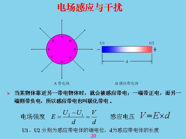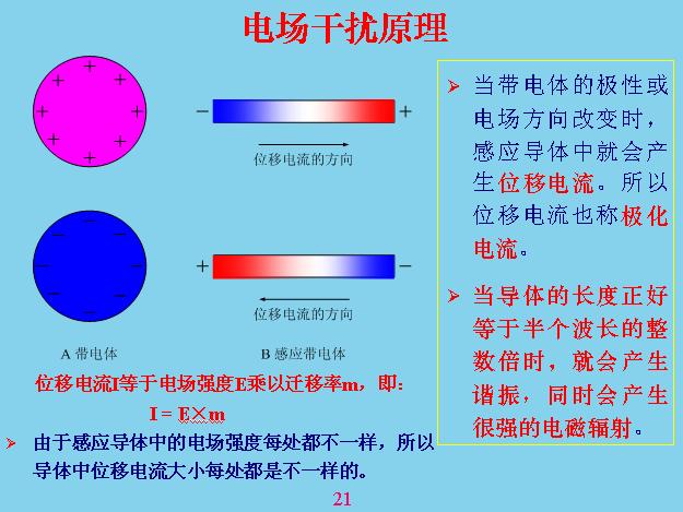 電磁干擾的原理是帶電體電磨和位能不斷的改變,會對感應體產生位移電流,當這邊是正的時候,電流的方向往這邊流,當是負的時候電流往另外一邊流。位移電流和一般電工學里面的位移電流不一樣,位移電流不需要回路,在任何一個導體里面都會產生位移電流,并且位移電流的大小在這個導體里面的每個地方都不一樣,不管這個怎么變化,中間位移電流等于零,只在兩端位移電流是最的大,中間那個地方等于零。如果你不好理解,你把這個當成一根天線就理解了,天線發(fā)射電磁波的時候也是沒有回路的,就是靠不斷的對它進行充放電,這個原理是一樣的。還有一種情況,當兩個變換的速度和來回移動的方向、距離正好是半個波長的時候它會產生諧振,這個在天線理論里面可以學到。因為位移電流是有速度的,不能說速度等于無窮大,我這邊變你也變,如果移動有速度就會產生疊加和抵消的作用,就會產生諧振。