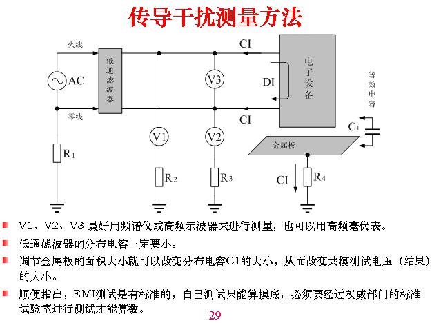 傳導干擾測量原理。這里面?zhèn)鲗Ц蓴_有兩個干擾,一個是共模,一個是差模,這樣一個回路是流進入又流出來的,這叫做差模。這兩個同時進去從另外一邊流出來叫共模,共模干擾很簡單,就是以大地為一端,另外一端是以上面的線路、設備,不管什么線為一端測到的電壓,這叫做共模干擾。因為測量的時候必須要與一根電路連接,先測三個電壓,這是測這個與大地之間的電壓,這是測兩條線之間的電壓,然后得出結算公式。V1=CI-DI,就是共模干擾減去差模干擾。V2=CI+DI,V3=DI,R1、R2、R3、R4為接地電阻,C1為分布電容,如果到檢測所去測之前自己一定要先進行摸底測試,用一塊墊板或金屬板放在下面接地,等于說分布是固定的,利用標準一塊板與機器造成分布電容,一般是一個平方米等等,是由他們定的,你可以做試驗,測多大都沒有關系,但它是固定的,測電視機是什么樣,測手機是什么樣,這是不一樣的。傳導干擾測量方法。分布電容在這一塊金屬板,與它之間產生分布電容,當然用這個板帶分布電容,測出來的結果數字越大,這只是用來做對比,以此為基礎。我們做摸底可以用大一點測,容易測得到,但你測得不算數。