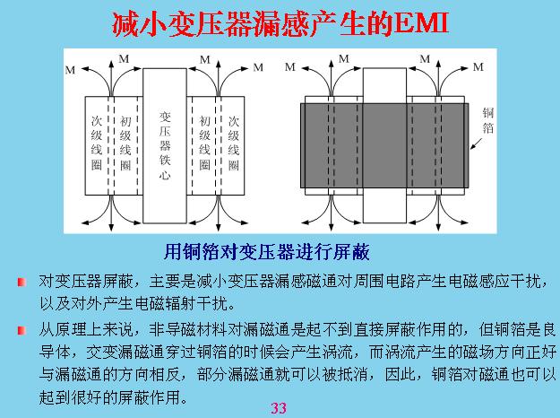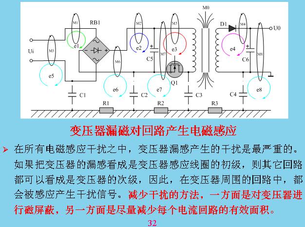 這個更加具體,有電力穿過的時候會產生電力線,電力線會產生共模干擾,這幾個都是共模干擾,那些都是差模干擾。這些干擾主要是如何產生的?本身線路里面只有電流流過,構成一個線圈或導線都會產生干擾,最大的是變壓器漏感,這是其他回路的好幾十倍。所以變壓器漏感最好進行屏蔽?怎么屏蔽呢?在線圈的外邊用一層金屬,鋁片也好,銅片也好,一般用銅片包起來,包起來應該讓它短路,就是用焊絲焊起來,漏感在上面也會產生渦流,一產生渦流就會產生抵消干擾的磁場,就相當于把漏感抵消掉。