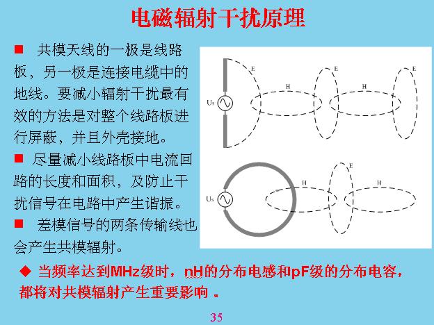 電磁輻射干擾原理。主要也是有兩種,一種是電場輻射,電場輻射最典型的就是半波陣子,如果上面這根天線的波程是半個波程,電場是最大的,現(xiàn)在一般都很少有半波程,有一段接大地,有一端作為發(fā)射天線,像中波天線就是這樣,電信天線就是半波陣子。還有一個是磁場天線,磁場天線相當于變壓器的回路,不過這個天線有參數,或者半波陣子波程最好是半個波程,根據這個波程發(fā)射,不是隨便的,長的短的效果是不一樣的。電磁輻射產生這兩個陣子還會充放電,一下子到正,一下子到負,相當于電容。充放電在這里會產生磁場,這個磁場又產生電阻,這就是麥格思維,不斷、不斷的傳下去,在這里面的旋度等于面積的強度,這就是麥格思維方程。電磁波傳播是這樣的,輻射原理主要是這個原理。
