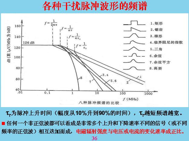 各種干擾脈沖波形的頻譜。輻射和干擾的頻率有關,頻率一般都是指正弦波,這樣比較好理解,對于方波或正弦波的波形,一般我們都可以把它看成是無窮多個上升率不同的波形進行疊加,也就是用基數展開,這是數學表達方式,比較正確是用不同的上升率,不同的波形進行疊加,但上升率不好理解,一般都是用正旋波表示。這里面波種不同的波形,它產生的干擾不一樣。這種的頻譜是最寬的,這種是高新的,接近于正弦波。120dB的時候是1v,126dB就是2v,大家知道dB是什么嗎?它一般用來表示放大倍數,就是輸出電壓與輸入電壓之比,取數值大于20。為什么用這個倍數來比?用倍數比相當于把視角范圍縮小,讓你好看,如果從線性來看,一個毫伏一直到兩伏就沖到天上去了,不好看。用對數坐標表示,越往下越壓縮,前面是壓縮比較小,這邊也是。這里變成10,變成了100,變成1000,這是在電工里面用量表示,用倍數表示,每6dB就差1倍,大家記住。這里是60÷20=3,是3個據波,這里是1000微伏,120是正極,1V+6dB=2v。到測試所去測試給一個曲線,很多人問我dB是什么意思?dB就是一個坐標,后面會加一個單位,一個毫伏0dB就是一個毫伏。功率不是20倍表示了,而是用10倍表示,每3dB差一倍功率,電壓就是每6個dB差一倍。