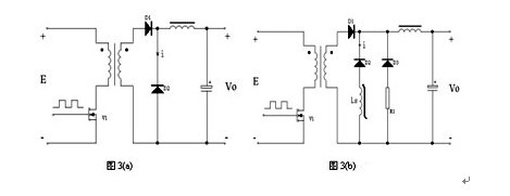 在圖3(a)所示的正激電源電路中,當初級功率管V1開始導通,次級整流二極管D1開始導通,D2開始截止時,由于二極管PN結的電荷存儲效應,D2中流過了電流變化率di/dt很大的反向恢復尖峰電流i,致使V1、D1中也有相應的尖峰電流流過,在漏感、線電感等因素的共同作用下會在電源輸出端產生高頻的導通噪聲。在D2上施加的反向電壓越大,D2的反向恢復時間越長,反向恢復電流變化率di/dt就越大,電源輸出噪聲也就越大。大的反向恢復尖峰電流,不僅會產生電源噪聲,也容易損壞整流器件。[page]