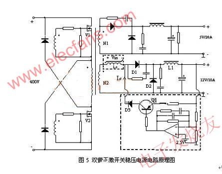 磁放大器穩壓是利用可飽和電感導通延時的物理特性來控制開關電源的占空比和輸出功率,穩定電源輸出電壓的一種方法。在可飽和電感上加上適當的采樣和控制元件,調節其導通延時的時間,就可以構成最常見的磁放大器穩壓電路。圖5是一個輸入為110Vac~220Vac/50HZ,輸出為5Vdc/20A,12Vdc/10A的雙管正激開關穩壓電源,其中5V是主控回路。其輔路12V輸出電流較大,對穩壓精度和負載穩定度都有較高要求,采用普通的方法穩壓效果都不是很理想,如果采用磁放大器穩壓技術就可圓滿解決這一問題,使穩壓電路的結構簡單,耗散功率小,并可達到毫伏級的穩壓精度。