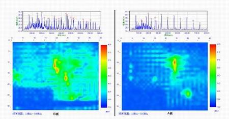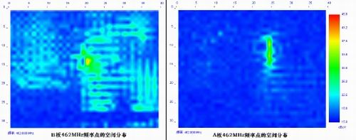 從空間圖中可以看出A板的總的電磁干擾分布區域比B板的小得多。再來看看某一個頻率點的電磁干擾分布情況。從圖8所示的462MHz這一個頻率點的電磁干擾分布情況來看,A板的幅度小,而且區域很小。B板的幅度大,而且分布區域特別廣。