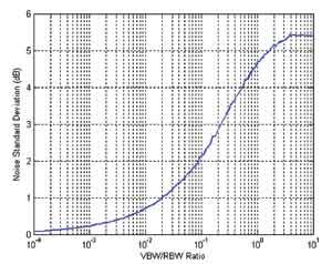 圖5 VBW/RBW之比對(duì)隨機(jī)噪聲信號(hào)標(biāo)準(zhǔn)偏差的影響。在VBW不小于3倍的分辨率帶寬時(shí),其對(duì)VBW的信號(hào)偏差沒(méi)有實(shí)際影響