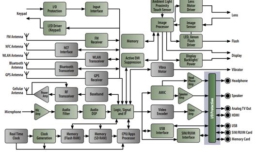 圖7:智能手機框圖及需要保護的I/O接口(見右下側淺藍色背景區域)