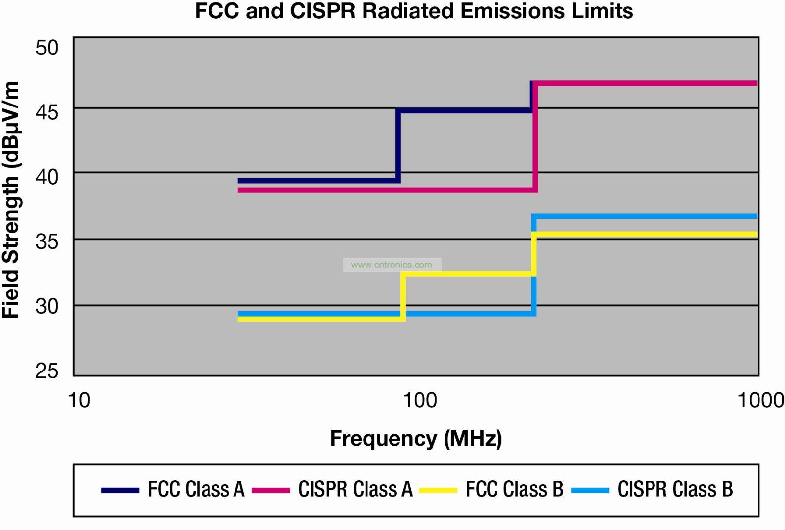 圖2 中,A 類限制針對商業(yè)、工業(yè)或者企業(yè)環(huán)境下使用的電子設(shè)備。B 類限制針對家用電子設(shè)備。A 類限制也可能適用于家用電子設(shè)備。B 類限制更加嚴(yán)格,因為這類設(shè)備可能會靠近TV和無線電接收設(shè)備放置。