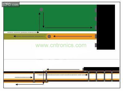 流經所布線路的所有電流都有相等的回流。耦合策略固然很多,不過回流通常流經相鄰的接地層或與信號線路并行布置的接地。在參考層繼續時,所有耦合都僅限于傳輸線路,一切都非常正常。不過,如果信號線路從頂層切換至內部或底層時,回流也必須獲得路徑。
