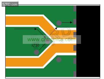 時鐘分布或合成器設備路由出來、用于承載相同頻率的跡線集群可能相鄰而行,因為干擾源音調已經存在于接收器線路上。不過,分組的線路最終會分散。分散時,應在分散線路之間提供接地灌流,并在其開始分散的地方灌入通孔,以便感應回流沿著額定回流路徑流回。在圖3中,接地島末端的通孔可使感應電流流到參考層上。接地灌流上其它通孔之間的間隔不要超過一個波長的十分之一,以確保接地不會成為共振結構。