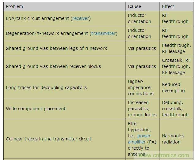 本文羅列了各種不同的設(shè)計(jì)疏忽,探討了每種失誤導(dǎo)致電路故障的原因,并給出了如何避免這些設(shè)計(jì)缺陷的建議。本文以FR-4電介質(zhì)、厚度0.0625in的雙層PCB為例,電路板底層接地。工作頻率介于315MHz到915MHz之間的不同頻段,Tx和Rx功率介于-120dBm至+13dBm之間。表1列出了一些可能出現(xiàn)的PCB布局問(wèn)題、原因及其影響。