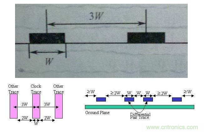 3W原則是指多個高速信號線長距離走線的時候,其間距應(yīng)該遵循3W原則,例如時鐘線,差分線,視頻、音頻信號線,復(fù)位信號線及其他系統(tǒng)關(guān)鍵電路需要遵循3W原則,而并不是板上所有的布線都要強(qiáng)制符合3W原則。