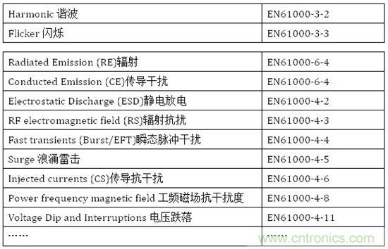 EN61000-3-2、EN61000-3-3、EN61000-6-4、EN61000-4-2、EN61000-4-3、EN61000-4-4、EN61000-4-5、EN61000-4-6、EN61000-4-8、EN61000-4-11。