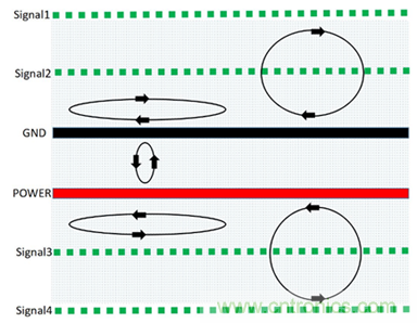 PCB疊層EMC規(guī)劃與設(shè)計思路的核心就是合理規(guī)劃信號回流路徑,盡可能減小信號從單板鏡像層的回流面積,使得磁通對消或最小化。