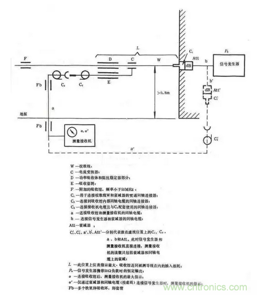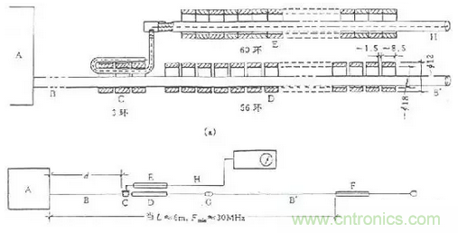 電纜上產(chǎn)生的共模電流,以免影響測(cè)量結(jié)果。測(cè)量布置如圖19(b)所示,測(cè)試應(yīng)在屏蔽室內(nèi)進(jìn)行,電源線長度應(yīng)大于6m,即大于30MHz的半波長加上吸收鉗的長度。對(duì)于每一個(gè)測(cè)試頻率點(diǎn),吸收鉗都應(yīng)沿著電源線移動(dòng),找出最大值,因?yàn)楣材k娏髟趯?dǎo)線上是以駐波形式出現(xiàn)的。功率吸收鉗測(cè)量系統(tǒng)應(yīng)事前進(jìn)行校準(zhǔn),得到修正因子—頻率曲線。校準(zhǔn)布置如圖20所示。