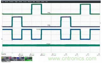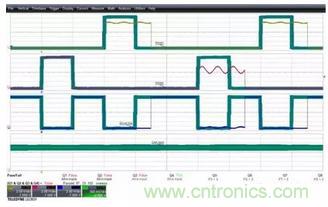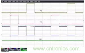 下圖3顯示的是關閉模板后示波器采集到的數據信號,每個信號的波形形狀可以被清晰的顯示和觀察。示波器基于通道2的邊沿觸發,所有4個波形同時被捕獲。