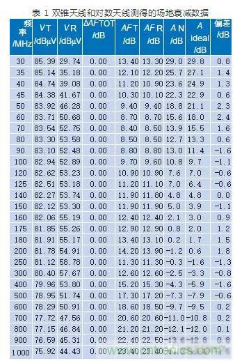 表1:雙錐天線和對數(shù)天線測得的場地衰減數(shù)據(jù)