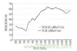 從圖 5 和圖 8 中不難看出,不同材質(zhì)的試驗桌產(chǎn)生最大差異的頻率相同,均在 700~900 MHz 之間。