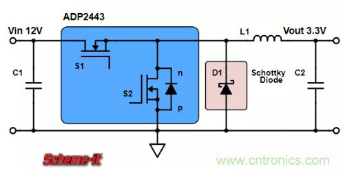 下圖是一個典型的降壓同步開關穩壓電路(查看Scheme-it原理圖),其使用ADI ADP2443為同步開關穩壓芯片。采用N溝道MOSFET和額外的肖特基二極管,可最大限度地減少干擾。