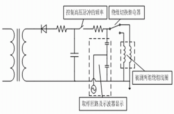 目前市面上有不少專用的繞組匝間沖擊耐電壓測試儀,這類匝間沖擊耐電壓測試儀產品的基本原理都是以同型號繞組感抗相等為前提,采用波形比較法,以高壓脈沖對等效過電壓、無損模擬試驗。然后通過示波器這樣的裝置通過完全一致的取樣回路來測量這個脈沖在繞組線圈中的振蕩波形,如果兩個波形不一致,那么表明這兩組線圈中至少有一組存在匝間短路的故障。其測量原理圖如下: