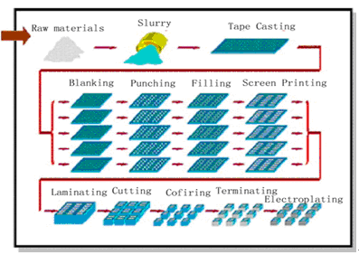 LTCC技術是于1982年休斯公司開發的新型材料技術,是將低溫燒結陶瓷粉制成厚度精確而且致密的生瓷帶,在生瓷帶上利用激光打孔、微孔注漿、精密導體漿料印刷等工藝制出所需要的電路圖形,并將多個被動組件(如低容值電容、電阻、濾波器、阻抗轉換器、耦合器等)埋入多層陶瓷基板中,然后疊壓在一起,內外電極可分別使用銀、銅、金等金屬,在900℃下燒結,制成三維空間互不干擾的高密度電路,也可制成內置無源元件的三維電路基板,在其表面可以貼裝IC和有源器件,制成無源/有源集成的功能模塊,可進一步將電路小型化與高密度化,特別適合用于高頻通訊用組件。
