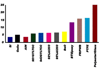 材料的許多熱機械性能也是影響LTCC器件可靠性的一個主要因素,其中最關健的是熱膨脹系數,應盡可能與其要焊接的電路板相匹配。圖4是IC封裝的各材料的熱膨脹系數。LTCC、氧化鋁和其他陶瓷材料的TCE接近Si、砷化鎵及磷化銦的TCE值,從而可以減小機械應力,應用在大尺寸的晶片上不需要使用有機疊層。同時,減小熱不匹配性可以增強機械的整體性,降低溫度特性的變化,以及增加數位、光學和電子技術的集成能力。