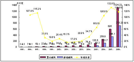 圖1 1995-2008年中國(guó)風(fēng)電裝機(jī)容量及其增長(zhǎng)情況