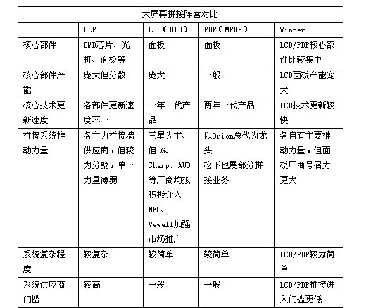 以LCD/PDP為代表的平板產(chǎn)業(yè)鏈卻有著規(guī)模龐大且集中度高的特點(diǎn),面板廠商作為整個(gè)產(chǎn)業(yè)的主要驅(qū)動(dòng)力量,很好的扮演了大屏幕拼接技術(shù)和市場(chǎng)推廣者的角色。雖然暫時(shí)只有Samsung作為主力推動(dòng)DID LCD拼接技術(shù)的力量,但是包括LG、Sharp、CMO、AUO等在內(nèi)全球主力面板廠商都已開始積極布局專業(yè)公共顯示面板及拼接顯示面板。LCD產(chǎn)業(yè)由于可以橫跨零售、商用、大屏幕拼接等諸多領(lǐng)域,規(guī)模更大,系統(tǒng)效率也更高一些。