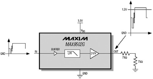 利用DirectDrive技術(shù),MAX9503能夠輸出接近零直流偏置的視頻信號,無需任何交流耦合電容。由于片內(nèi)反向電荷泵可產(chǎn)生負電壓,因此,這一技術(shù)使MAX9503能夠輸出地電平以下的信號。盡管DirectDrive增大了PQ,但由于PL降低,MAX9503的平均功耗能夠與MAX9502保持在同一水平。由于直流偏置接近地電平,MAX9503只需輸出較小的電流。