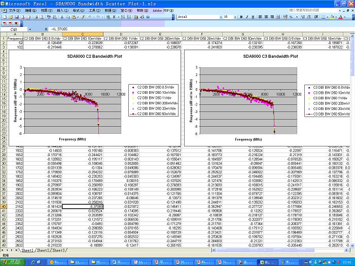 此外,在計(jì)量波特圖時(shí)需要對(duì)示波器每個(gè)檔位都進(jìn)行計(jì)量,最終產(chǎn)生的波特圖是所有檔位的結(jié)果疊加在一起的。波特圖的計(jì)量是需要半天時(shí)間完成的,并不是想象中那么輕松的工作。如圖8所示是力科SDA9000的波特圖,我特地將Excel中大量數(shù)據(jù)顯示給大家以使大家對(duì)校準(zhǔn)的嚴(yán)謹(jǐn)性有深刻認(rèn)識(shí)。 其垂直軸是-1dB/div, 疊加了10mv/div、20mv/div、50mv/div、200mv/div、500mv/div、1v/div等檔位的測(cè)試結(jié)果。 很多時(shí)候,我們的競(jìng)爭(zhēng)對(duì)手會(huì)把他們的波特圖畫(huà)成-10dB/div、只有一個(gè)檔位的測(cè)試結(jié)果拿給客戶(hù),并和力科提供的這種-1dB/div、各種檔位疊在一起顯示的結(jié)果放在一起進(jìn)行對(duì)比,然后他們告訴客戶(hù),他們的波特圖更平坦,更干凈,甚至將力科波特圖上面密密麻麻的點(diǎn)說(shuō)成是“噪音”大。這是有點(diǎn)貽笑天下的。 競(jìng)爭(zhēng)對(duì)手敢于一再采用這種做法,這是假設(shè)中國(guó)的工程師都沒(méi)有辨別力,獨(dú)立思考能力,是對(duì)工程師嚴(yán)重不尊重的公然欺騙行為。希望能引起大家注意。