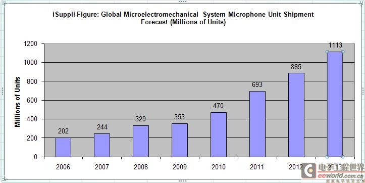 據(jù)iSuppli預(yù)估,盡管歷經(jīng)2009年的衰退,但在移動(dòng)手持裝置與其它類似應(yīng)用的強(qiáng)力驅(qū)動(dòng)下,2008至2013年,全球微機(jī)電系統(tǒng)(MEMS)麥克風(fēng)仍預(yù)計(jì)將成長(zhǎng)三倍以上。