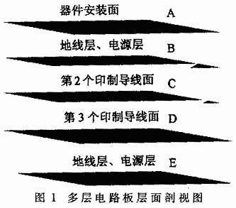 采用多層布線方式,電源、地線和信號(hào)分別占有獨(dú)立的層面(如圖1所示),這樣由整個(gè)層面構(gòu)成的電源線和接地線阻抗相當(dāng)?shù)汀k娐钒宓姆植茧娙萦筛鲗又g的距離和介電系數(shù)來決定,約為10~1000pF/cm2。圖1中的E層上下表面經(jīng)過絕緣處理,既能預(yù)防線路板向外輻射噪聲,又能防止線路板接受外來噪聲;同時(shí),電源線被密封在板內(nèi),幾乎不接受任何外來噪聲,而且內(nèi)部幾個(gè)供電面之間有很大的靜電電容,形成阻抗極低的供電線路,極大地提高了抗噪性能。
