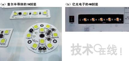 首爾半導體在原有2W/4W產品的基礎上增加了照明易用性良好的1W等級封裝(a)。億光電子也展出了該公司首款交流驅動封裝(b)。