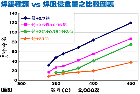 相比起傳統(tǒng)的共晶焊錫(63/37焊錫),在400℃的焊接溫度下,無鉛焊錫 錫+3.5銀+0.7銅 對(duì)焊咀的侵蝕速度要快3倍,而 錫+0.7銅更加要快4倍。
