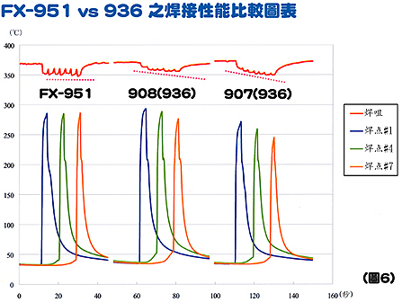 以下是FM-2025(FX-951焊臺(tái))與907及908(936焊臺(tái)) 之回?zé)崴俣缺容^。在電路板焊接位置的第 #1、#4、#7 三個(gè)焊點(diǎn)裝上溫度傳感器,分別使用FX-951、907及908進(jìn)行焊接,每3秒焊接一個(gè)焊點(diǎn),連續(xù)焊接7個(gè)點(diǎn),然后測試焊咀及焊點(diǎn)的溫度變化。(請參考下圖)