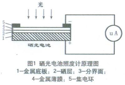 測量照度的儀器是照度計,或稱勒克斯計。照度計通常是由硒光電池或硅光電池和微安表組成,見圖1。硒光電池是把光能直接轉換成電能的光電元件。當光線射到硒光電池表面時,入射光透過金屬薄膜4到達半導體硒層2和金屬薄膜4的分界面上,在界面上產生光電效應。產生電位差的大小與光電池受光表面上的照度有一定的比例關系。這時如果接上外電路,就會有電流通過,電流值從以勒克斯(Lx)為刻度的微安表上指示出來。光電流的大小取決于入射光的強弱和回路中的電阻。照度計有變檔裝置,因此可以測高照度,也可以測低照度。