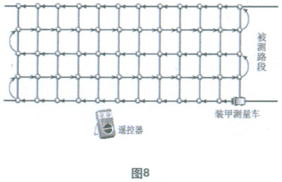 本方案是將具有記憶和存貯功能的TES—1333型照度記安置在高檔電動遙控的履帶式玩具裝甲車(以下簡稱為測試小車)上,該測試小車的驅動系統受站在路邊的測量者手中的遙控器和測試小車內安置的可編程控制器為主體的自動控制系統控制,當車內的自動控制系統啟動時,裝甲車將按照事先設定的動作程序沿如圖8所示的箭頭方向完成行走程序,并采用四點法在每個矩形網格的四角處自動完成照度測量和記錄,存貯任務,待全部程序結束后,測試小車在遙控器的操縱下自動返回測量者所在位置。遙控器的另一作用是在車內控制系統失靈的情況下,由測量者手動遙控完成全部的測量過程,并在道路出現行駛車輛時緊急召回測試小車。