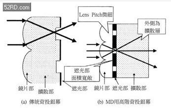 事實上早期的MD方式RP-TV都是使用CRT背投電視螢幕,因此始終無法充分發揮MD方式RP-TV的特性,有監于此日本凸版印刷公司首度開發如(圖五)所示MD方式RP-TV專用螢幕,由圖可知MD方式RP-TV專用螢幕的LenticularLens與遮光部各自獨立設置,尤其是遮光部設于擴散部后面革命性設計,使得該MD方式RP-TV專用螢幕可以具備極佳的光學特性。