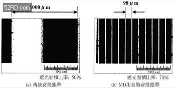 (圖六)是傳統與MD背投螢幕遮光部的比較,由圖可知即使相同的珠粒狀螢幕,畫面細膩度與遮光面積比率卻截然不同;(表一)是傳統與MD式背投螢幕的特性測試結果。