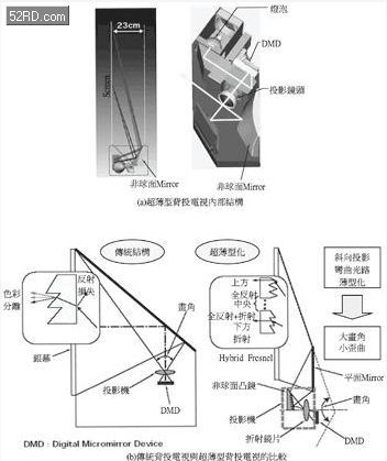 2000年日本三洋發表厚33cm、50吋背投電視,2002年三菱電機推出厚度只有23cm背投電視(圖八),該公司也于2004年突破20cm門檻,一般認為未來背投電視的厚度可望媲美電漿電視。背投電視薄型化的結果,業者必需開發特殊離軸型LenticularLensScreen與FresnelLensScreen。