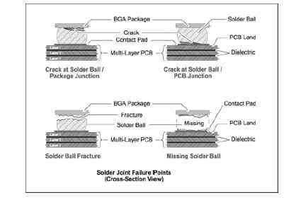隨著時間的推移,焊接部位會因為累積應力的損傷而產生裂縫。裂縫常見于器件與PCB焊接的邊緣。裂縫會造成焊接球與BGA封裝器件或PCB板的部分分開。一種典型的裂縫位置在BGA封裝和焊接球之間,另一種典型的裂縫在PCB和焊接球之間.對已有裂縫的焊接球的繼續損傷就會導致另一種類型的失效-焊接球斷裂。