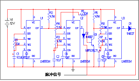 充電電路與脈沖信號(hào)結(jié)合,對(duì)電路進(jìn)行充電。這里的脈沖信號(hào)可用555定時(shí)器來(lái)實(shí)現(xiàn),用3個(gè)555來(lái)構(gòu)成一個(gè)頻率在周期變化的脈沖信號(hào)。電路圖如圖。