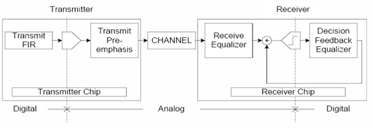 - 接收均衡器receive equalization:接收均衡器通過在接收端放大信號中的高頻分量來補償傳輸損耗,而低頻分量保持不變,讓信號眼圖張得最開。是預加重的一種替代或互補方案。
