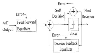 - 判決反饋均衡器Decision feedback equalization (DFE):根據解碼數據改變信號的幅度,一個經典的判決反饋均衡器的結構如圖3所示。
