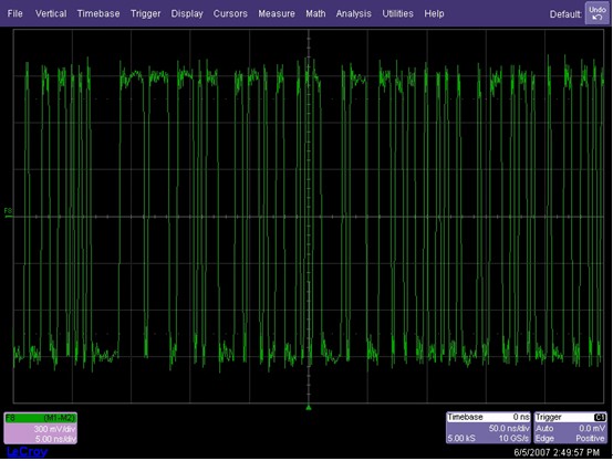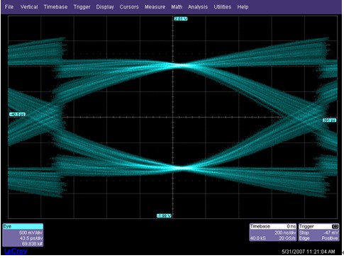 對比圖9可見,眼圖質量大大提升,這代表了系統的真實性能,在測試儀器內嵌入均衡技術已經成為高速測試的解決方案之一。注:眼圖顯示時看到波形切斷現象的解釋: