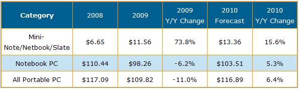 展望2010年筆記本電腦市場,出貨量將有強勁增長同時銷售價格降幅趨于緩和,使得便攜式電腦市場的營業(yè)額能達到1千170億美金,恢復(fù)到2008年的水平。上網(wǎng)本與平板電腦將是營收增長最高應(yīng)用別,主要是由于高單價產(chǎn)品的推出;不過上網(wǎng)本平均銷售價格將由2009年每臺400美元下滑到每臺300美元;而Apple iPad將是該應(yīng)用別主要出貨貢獻,平均單價從入門機種每臺499美金到高階機種超過每臺800美金之上都有。