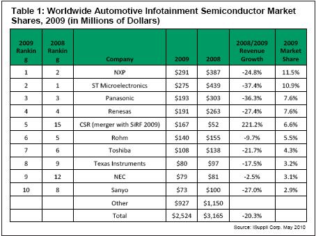 恩智浦半導體(NXP)2009年在全球汽車信息娛樂半導體市場排名第一,這是iSuppli公司從2005年開始追蹤該市場以來的第一次。
