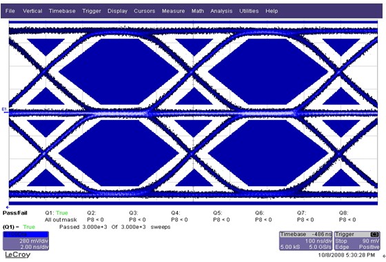 關(guān)于100Base-TX接口技術(shù)指標(biāo)的測(cè)試方法,《IEEE Std 802.3-2000》標(biāo)準(zhǔn)中也有詳細(xì)的說明, 工程師按照誘導(dǎo)發(fā)包的測(cè)試方法進(jìn)行了網(wǎng)口眼圖的測(cè)試,測(cè)試過程中發(fā)現(xiàn)測(cè)試網(wǎng)口出現(xiàn)了信號(hào)波形碰觸模板的問題,波形見圖3: